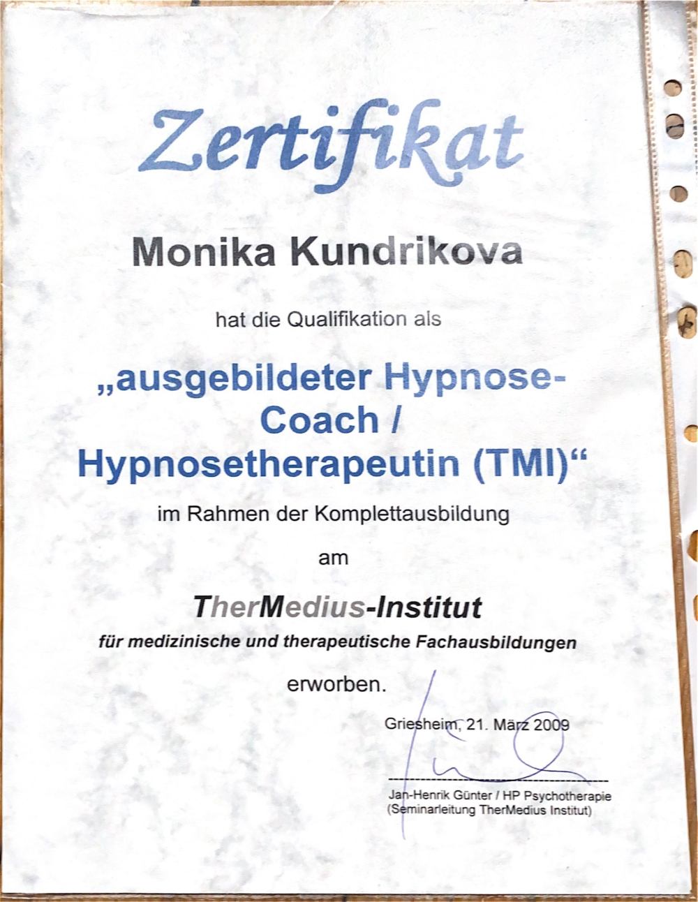 2009 Komplett-Ausbildung Hypnose bei TherMedius-Institut in Darmstadt mit Qualifikation als ausgebildeter Hypnose-Coach/ Hypnosetherapeutin (TMI)
